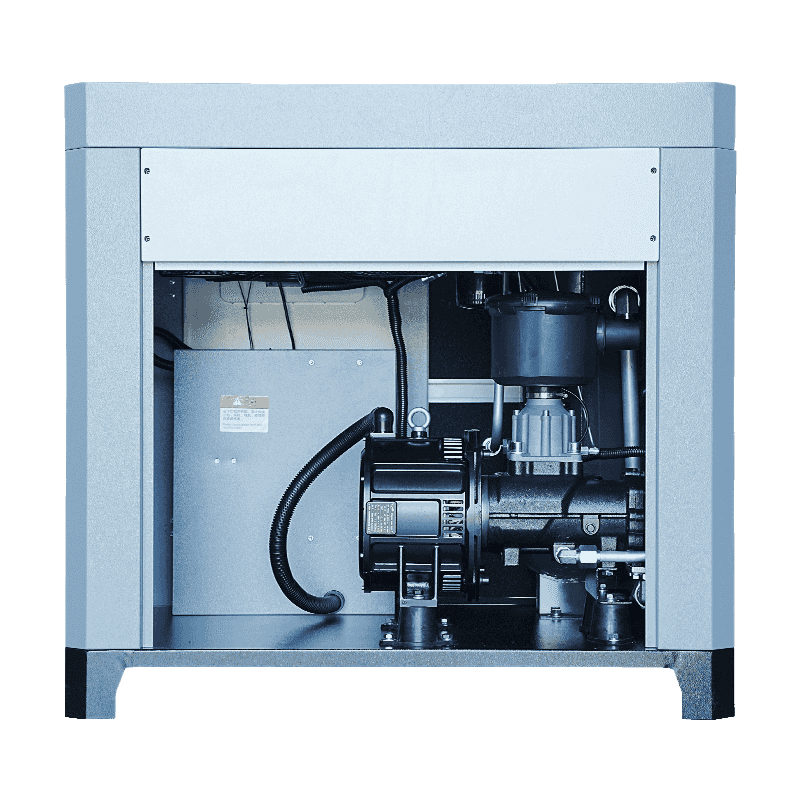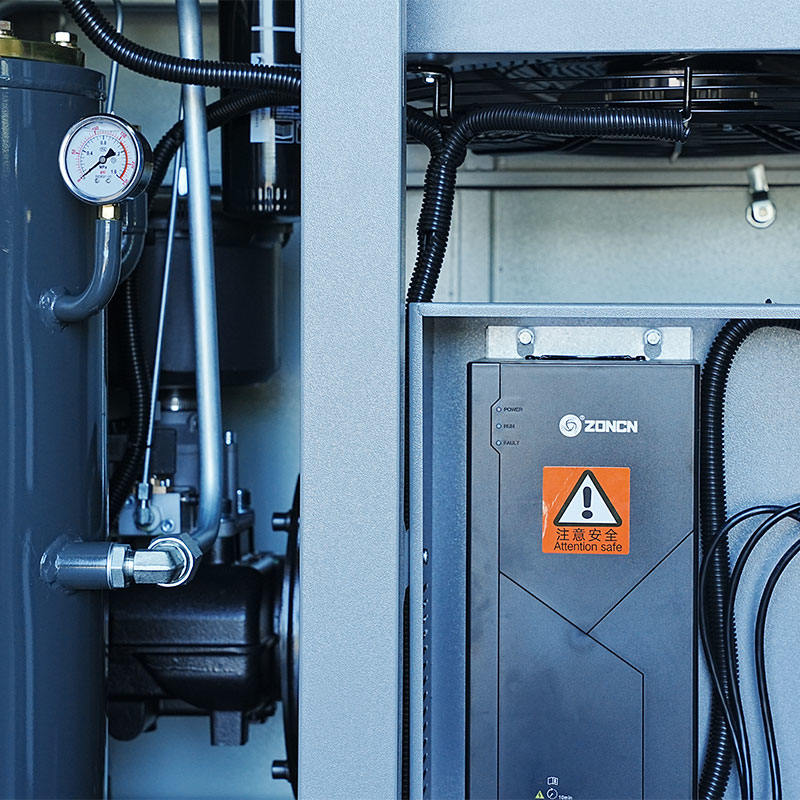 Mikroolejový dvojskrutkový jednostupňový kompresor s výkonom 30 HP obsahuje synchrónny motor s permanentným magnetom s ochranou proti nízkemu nárastu teploty a systémom riadenia frekvenčnej konverzie, pričom obe tieto funkcie ovplyvňujú vibračné charakteristiky. Priama a efektívna interakcia medzi motorom a skrutkovým rotorom zaisťuje hladký prenos krútiaceho momentu a zároveň znižuje mechanické kmitanie počas štartovania, prevádzky alebo spomalenia. Technológia frekvenčnej konverzie navyše umožňuje stroju postupne zrýchľovať a spomaľovať, čím sa minimalizujú náhle skoky krútiaceho momentu, ktoré môžu spôsobiť nežiaduce vibrácie. Mikroolejový mazací systém ďalej stabilizuje vnútorné komponenty znížením trenia medzi pohyblivými časťami. Výsledkom je, že hoci v určitých prostrediach môžu byť stále potrebné vonkajšie konštrukcie pohlcujúce vibrácie, vnútorná architektúra kompresora už poskytuje základ pre vyvážený a stabilný chod.